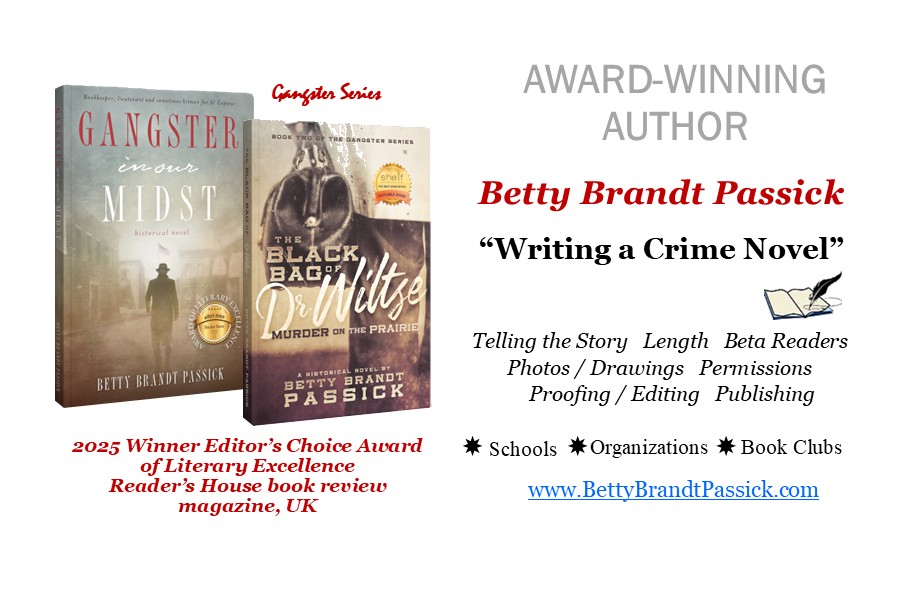 “Writing a Novel” (90 mins.): How did I come to write the historical crime novels in the Gangster Series? (There’s an interesting story behind each book.) Topic(s) Covered: No prior experience required. Program covers crime novel writing basics, plus brief intro to publishing and marketing. Audience: Customized for group interest. Outcome: Learn from an award-winning author the basics of crime novel writing.